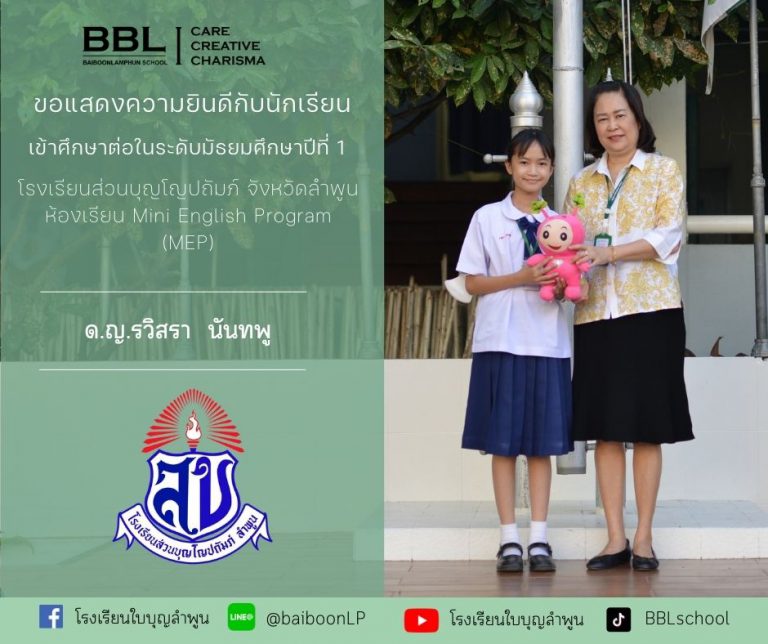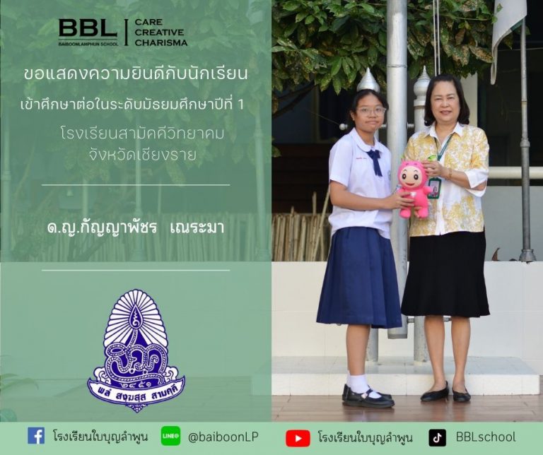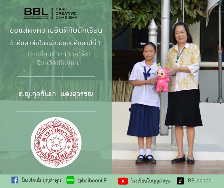 โรงเรียนใบบุญลำพูนขอแสดงความยินดีกับ ด.ญ.กวินทิพย์ ผโลศิลป์ ได้รับรางวัล“คนดีศรีสยาม” ประจำปี 2567