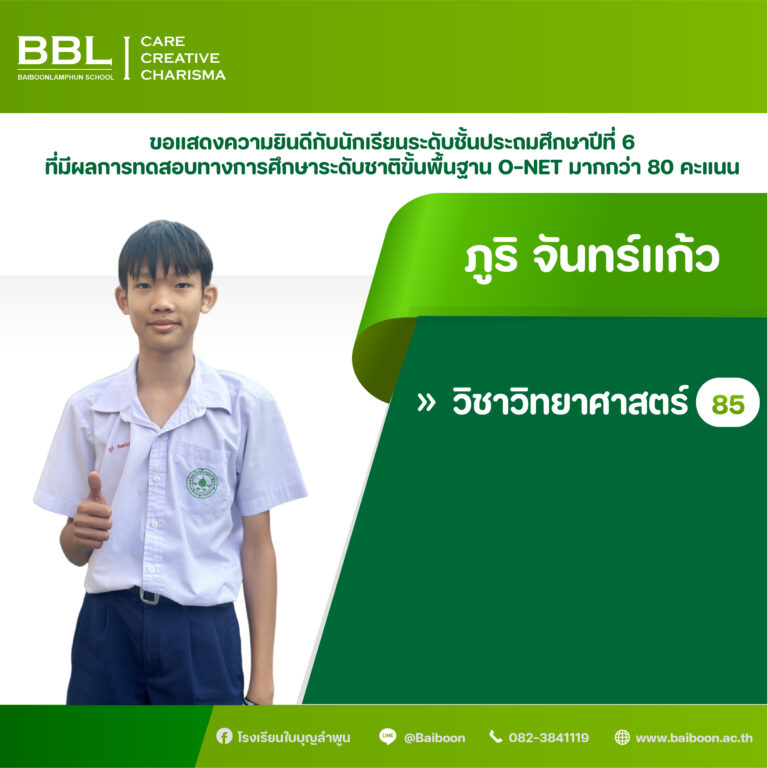 โรงเรียนใบบุญลำพูนขอแสดงความยินดีกับนักเรียนชั้นประถมศึกษาปีที่ 6 ที่มีผลการทดสอบทางการศึกษาระดับชาติขั้นพื้นฐาน (O – NET)