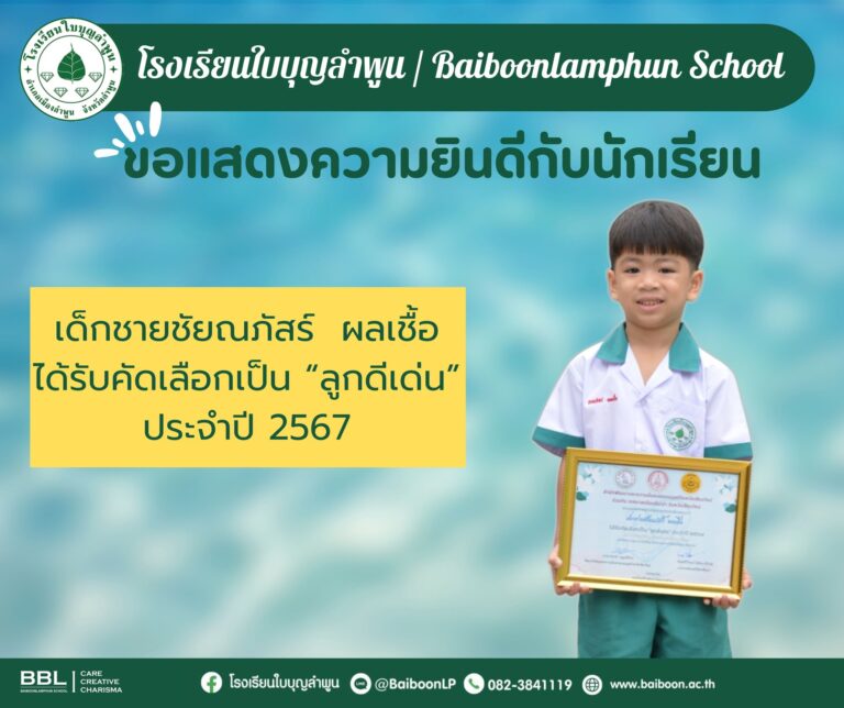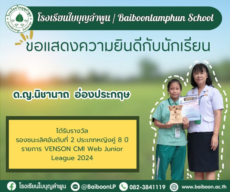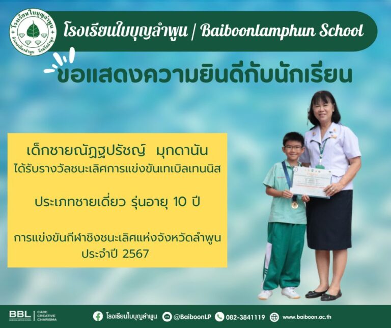 โรงเรียนใบบุญลำพูนขอแสดงความยินดีกับด.ญ.จิรัชญา แสนปวน ได้รางวัลชนะเลิศ รุ่นอายุไม่เกิน 12 ปีการแข่งขันแบดมินตัน รายการ Decathlon Chiang Mai Badminton competition year 2024 วันที่ 10 สิงหาคม 2567_____________________________สมัครเข้าเรียนทางออนไลน์ได้ที่ลิ้งค์ : รือที่โรงเรียน ห้องธุรการ อาคารเพชรใบบุญสอบถามเพิ่มเติม โทร 053-512274 หรือ 082-3841119 หรือ 063-7532380หรือทางออนไลน์ Line : @BaiboonLP_________________________#โรงเรียนใบบุญลำพูน#baiboonlamphun#โรงเรียนอนุบาล#ดูแลเหมือนแม่คนที่สอง#โรงเรียนในจังหวัดลำพูน#ลำพูน