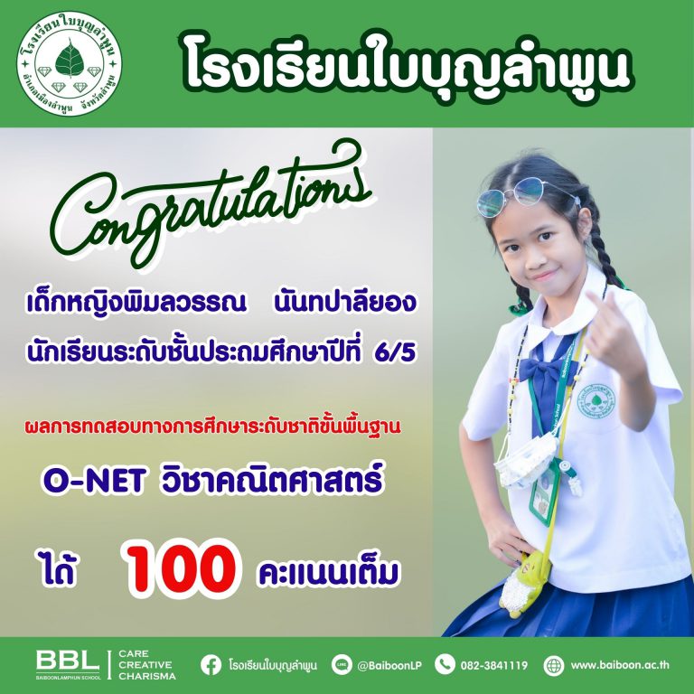 โรงเรียนใบบุญลำพูนขอแสดงความยินดี กับนักเรียนที่สอบได้ 100 คะแนน จากการทดสอบระดับชาติขั้นพื้นฐาน (O-NET) ระดับประถมศึกษาปีที่ 6 ประจำปีการศึกษา 2566ได้ 100 คะแนนเต็ม วิชาคณิตศาสตร์ จำนวน 2 คน1.เด็กหญิงพิมลวรรณ นันทปาลียอง2.เด็กชายเตชภณ แก้วยศได้ 100 คะแนนเต็ม วิชาภาษาอังกฤษ จำนวน 1 คน1.เด็กหญิงวรฤทัย มะโน